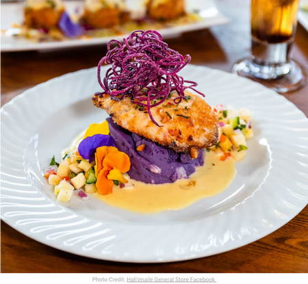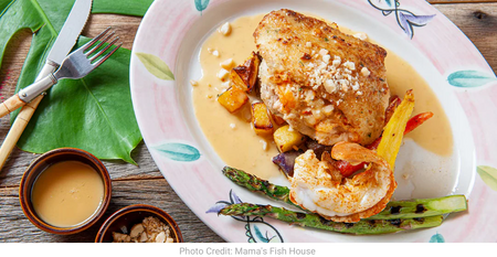 Must try: Macadamia Nut Crusted Mahi Mahi with Molokai whipped sweet potatoes, a tropical fruit salsa, and a mango lilikoi butter sauce