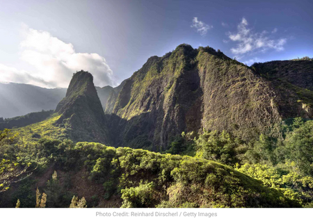 Towering emerald peaks, lush deep valleys, and a vibrant rainforest that thrives in the area's abundant rainfall! The centerpiece of the valley is the iconic ʻĪao Needle, a 1,200-foot (366-meter) tall volcanic rock pinnacle that rises dramatically from the valley floor. The trail is relatively short, about 0.6 miles, easily accessible for a wide range of hikers. Make sure to visit the nature center as well. (See on map.)