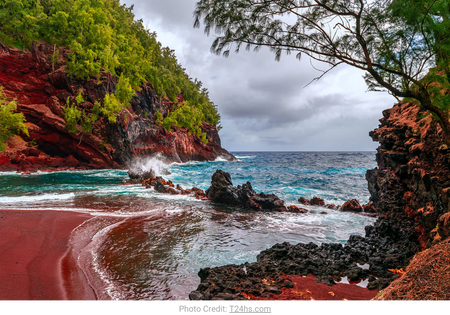 Known as the Red Sand Beach, this hidden gem is located on the rugged coastline of Hāna. Exercise extreme caution accessing the beach, as it requires a short but steep hike along a narrow, rocky path. Perfect for picture taking or relaxing on the red sand shores or observe through photos only!