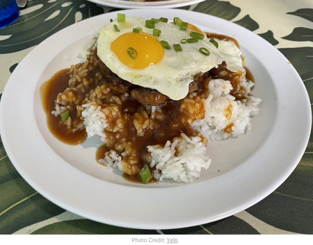 A must-try local favorite! A bed of rice, topped with homemade hamburger patties, any-style eggs, and gravy all over.