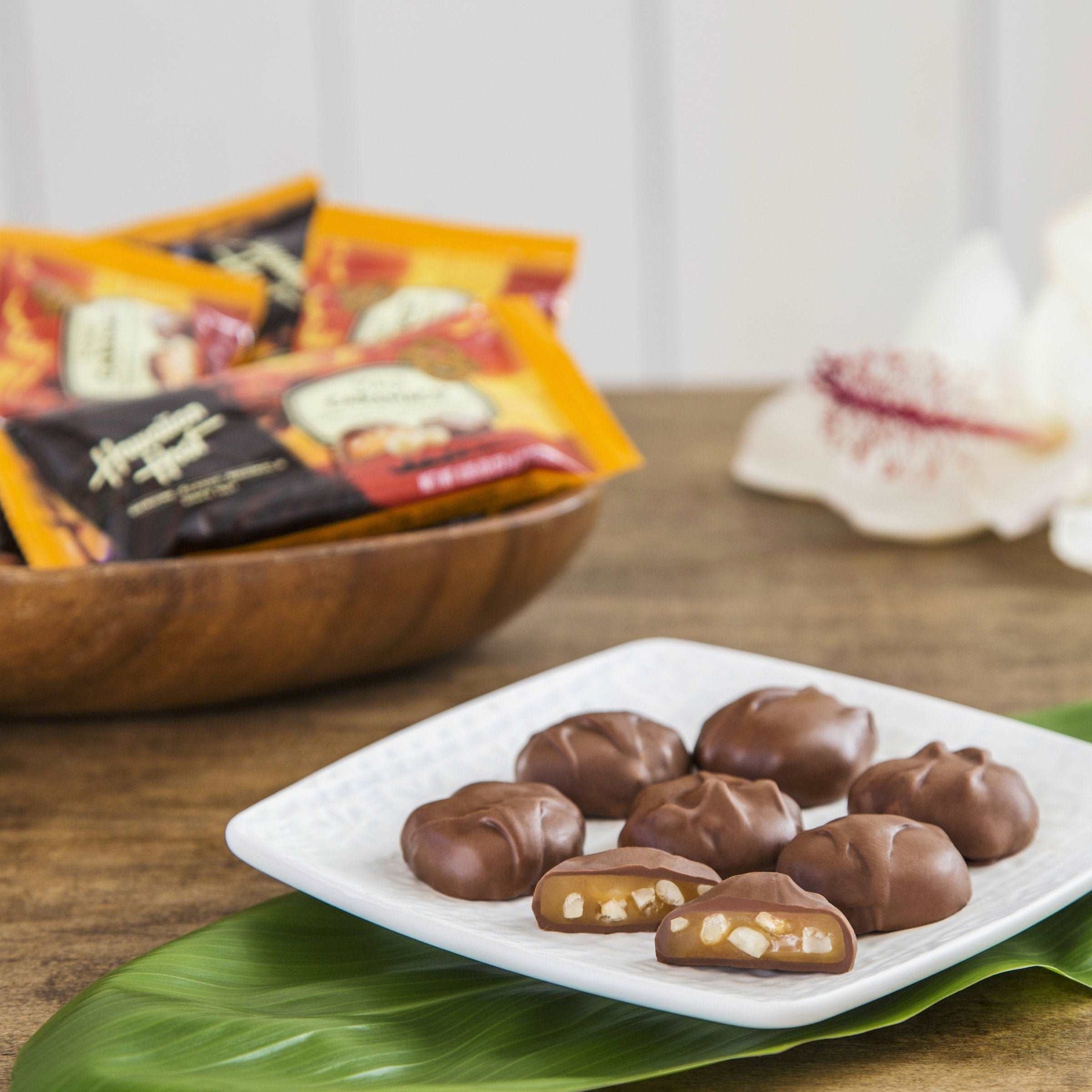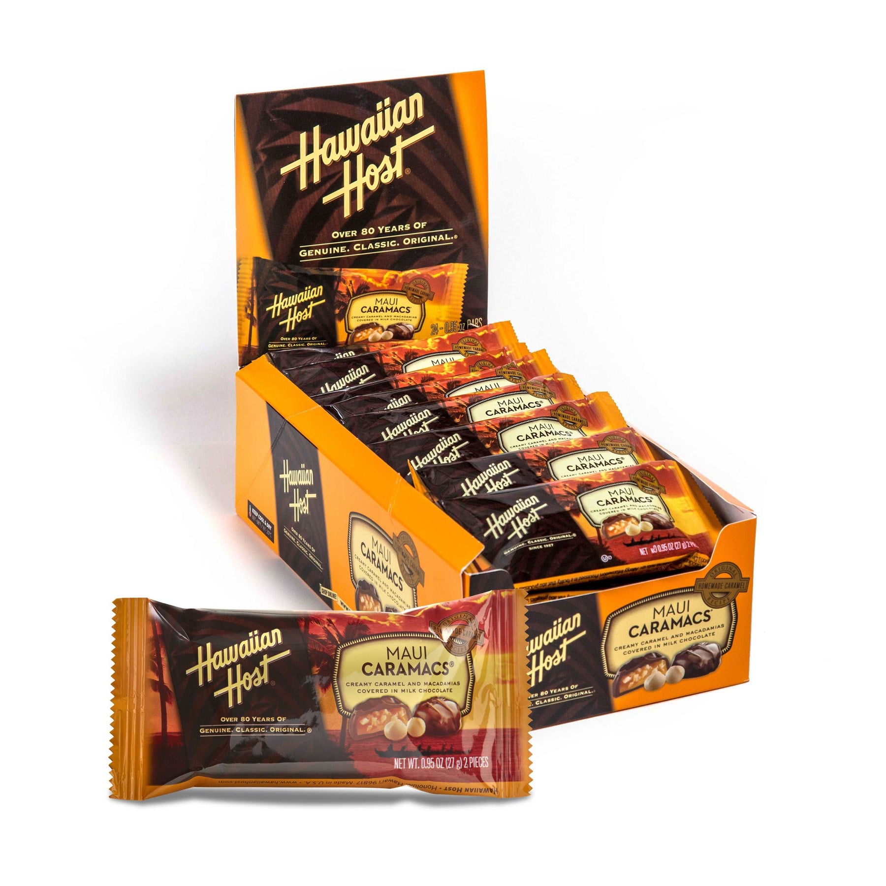 Rich, buttery caramel shares the spotlight with dry-roasted macadamias in this delicious indulgence. To make our famous Maui Caramacs, we smother macadamias in our house-made caramel and then cover them in smooth milk chocolate. These snack-sized local favorites are great for sharing—or as tag-along treats when you're on the go. Each box contains (24) .95oz two-piece snack packs.