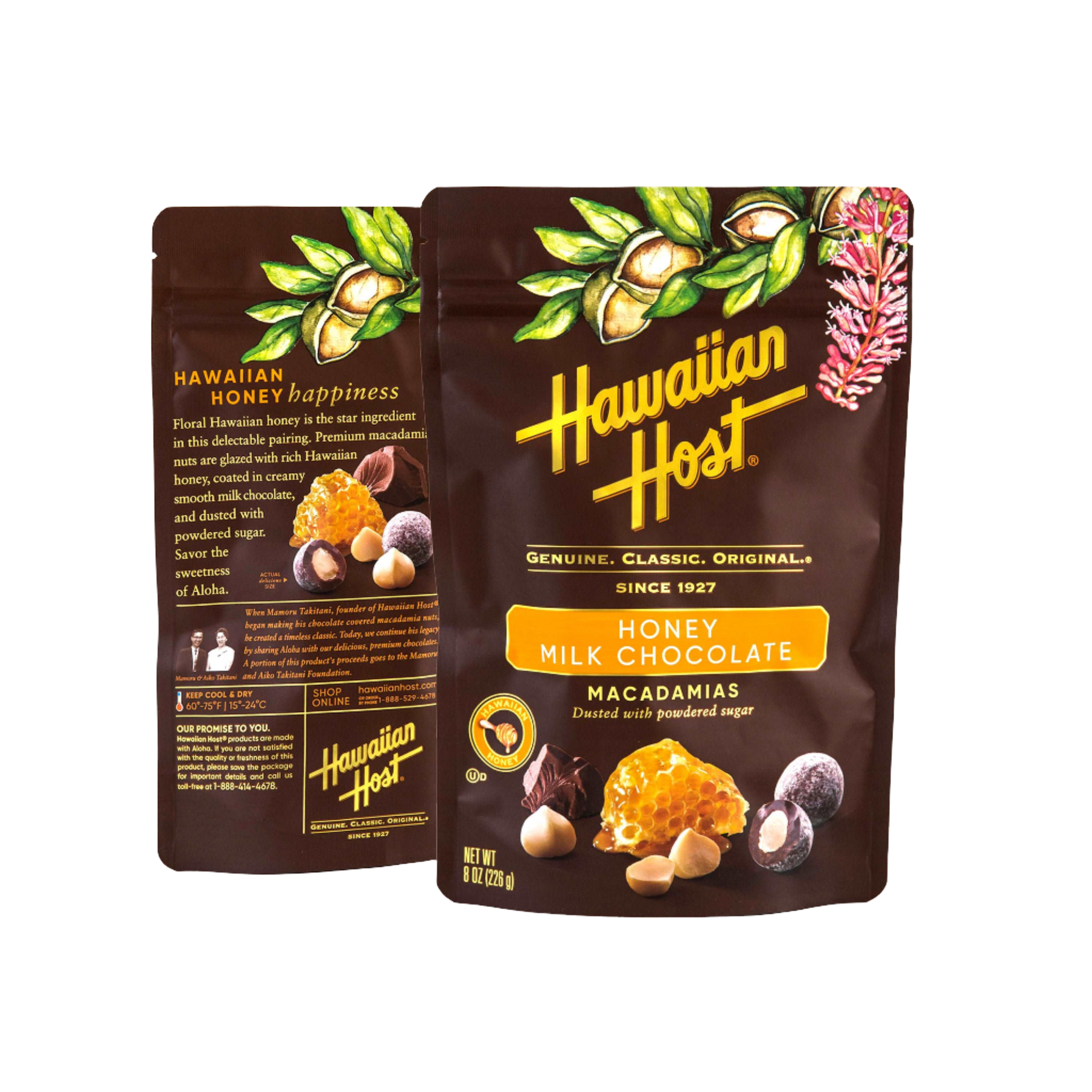 Premium macadamias are glazed with rich Hawaiian honey, coated in creamy milk chocolate, and then dusted with powdered sugar.